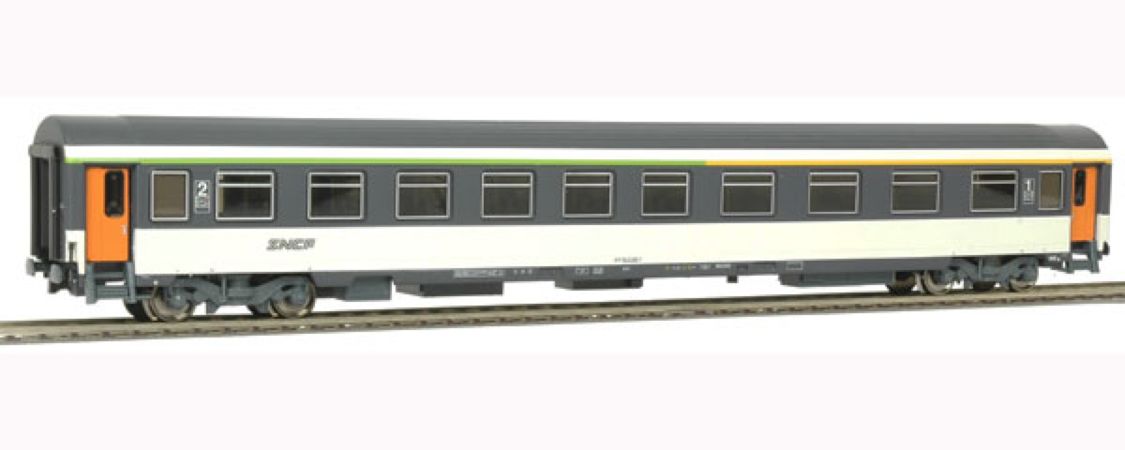Modèle réduit d'une voitures mixte 1ère / 2ème classe CORAIL de la SNCF avec logo Spaghetti de l'époque V.