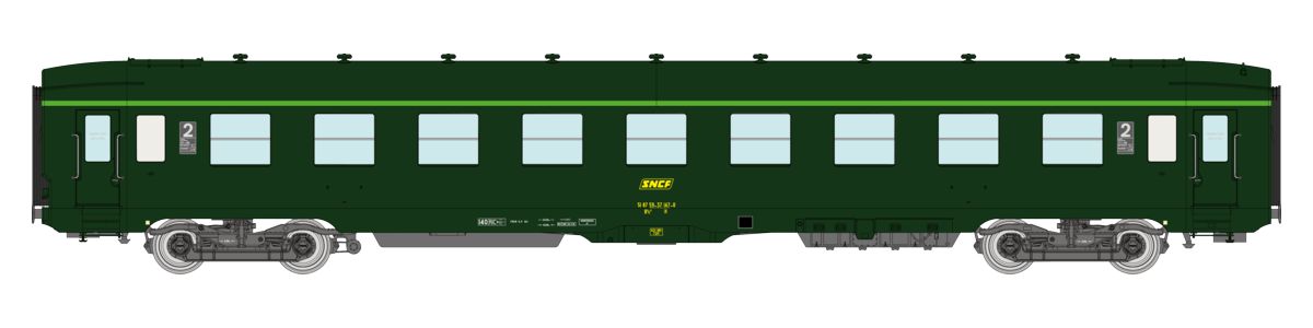 Voiture voyageurs DEV AO B9c9 Vert 301, logo encadré cartouche Corail