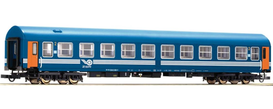 Modèle réduit Roco représentant une voiture couchette pour train rapide de type Y des Chemins de fer de l’État slovaque.