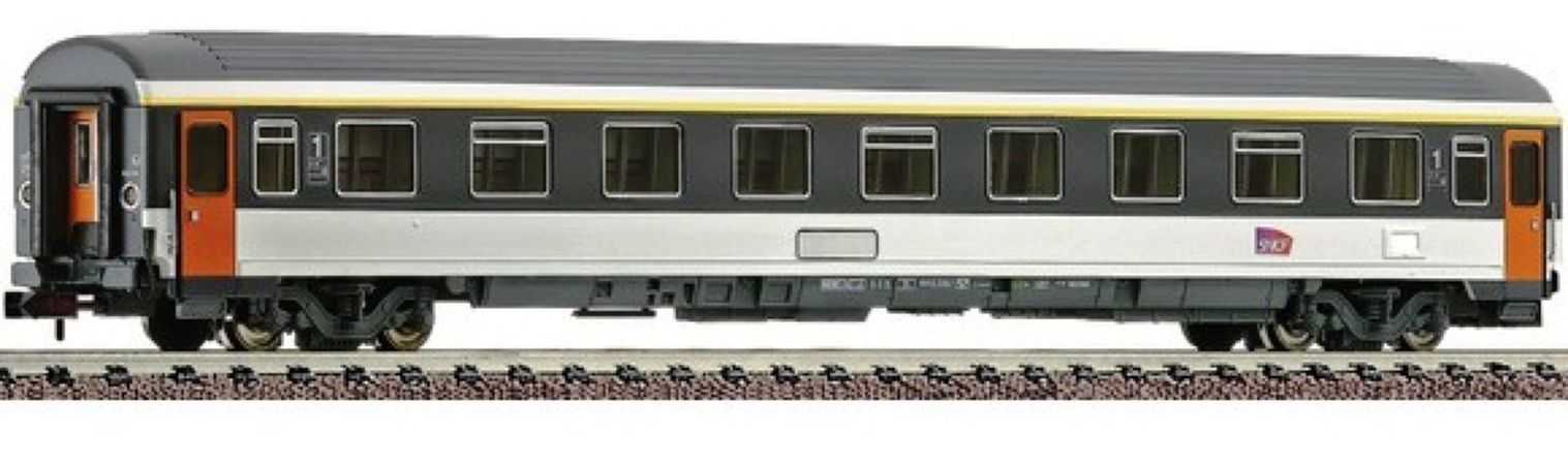 Modèle réduit Fleischmann finement détaillé représentant une voiture voyageurs 1ère classe CORAIL SNCF à l'échelle N avec équipement intérieur et pré-équipé pour l'éclairage intérieur.