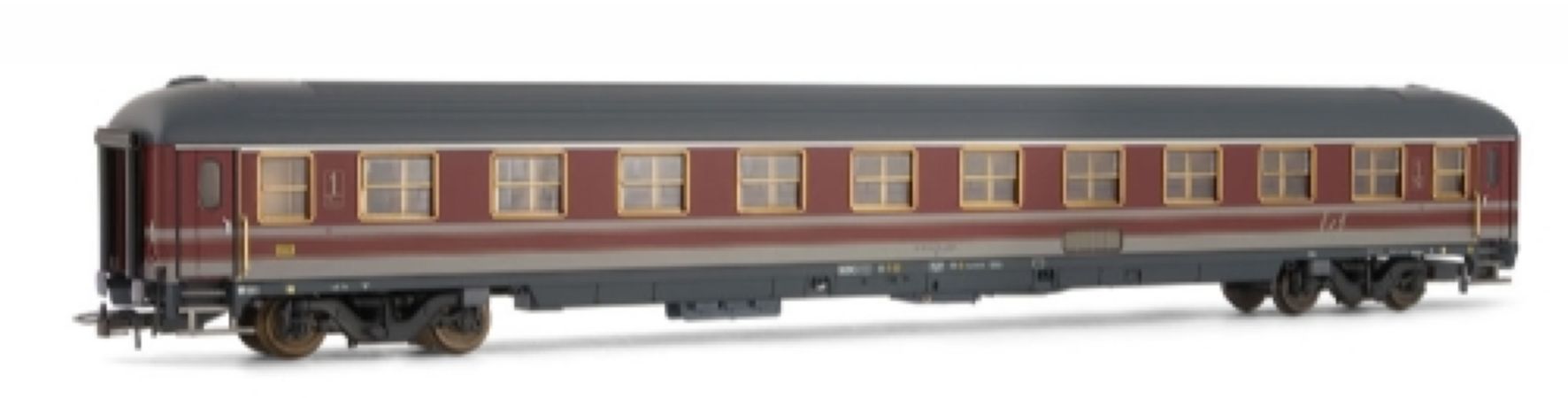 Voiture voyageurs 1ère classe type UIC X-high speed,livrée “Gris-Rouge” FS avec attelages courts NEM à élongation et tampons avec ressort.