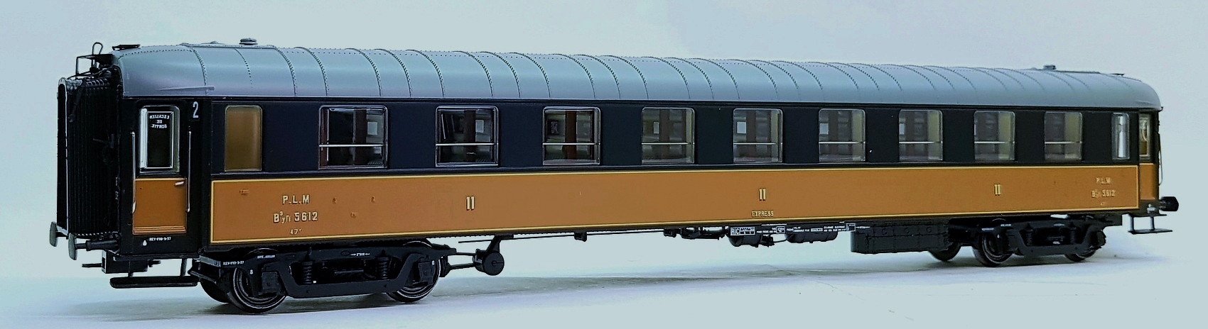 Représentation très fidèle d'une voiture B9yfi couleur noir et jaune terre de sienne avec filets jaunes, bogies M1, des Chemins de fer du P.L.M.