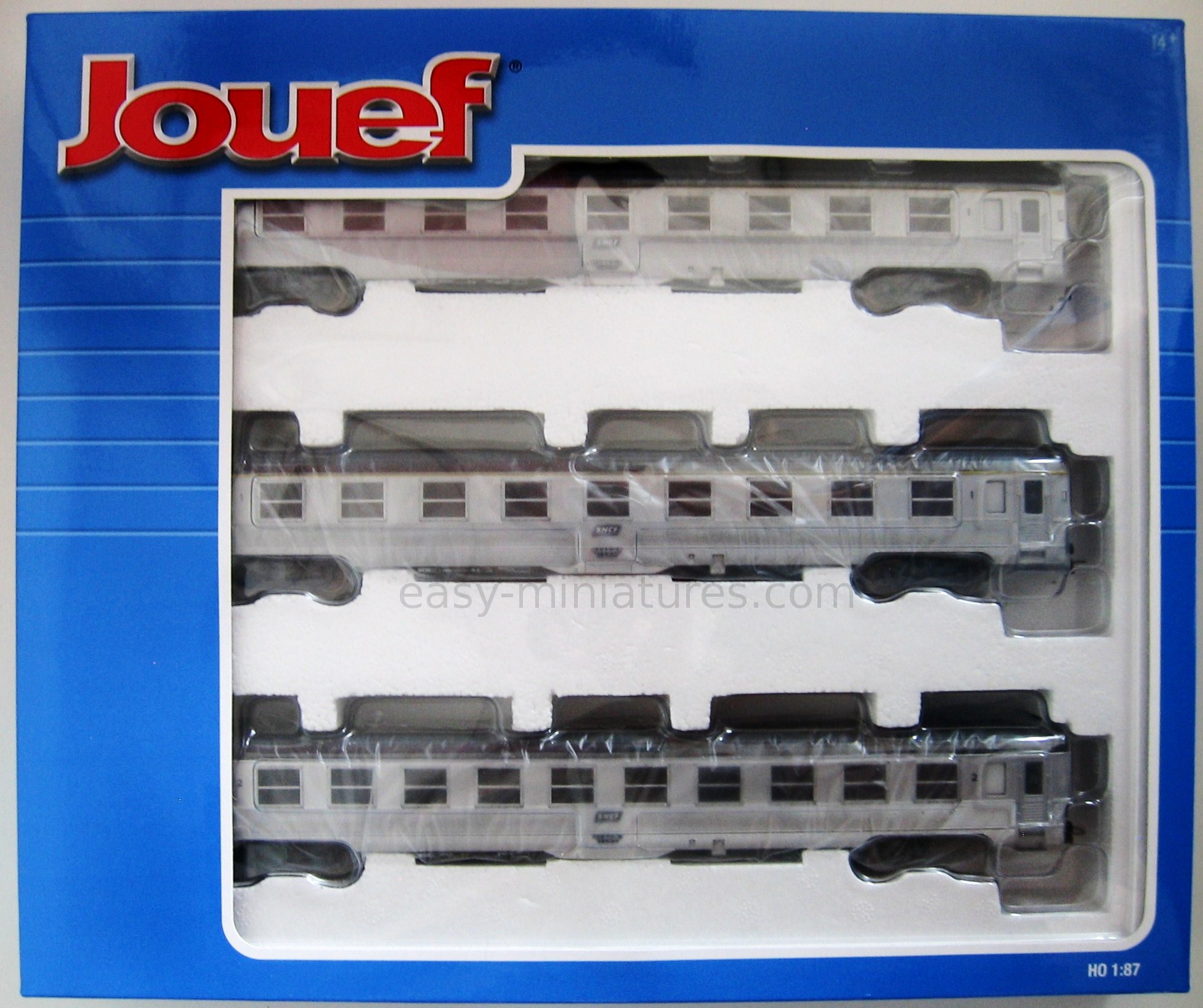 Coffret de la marque Jouef composé d'une voiture voyageurs à compartiments 1ere classe, une voiture voyageurs à compartiments 2ième classe et une voiture-bar.