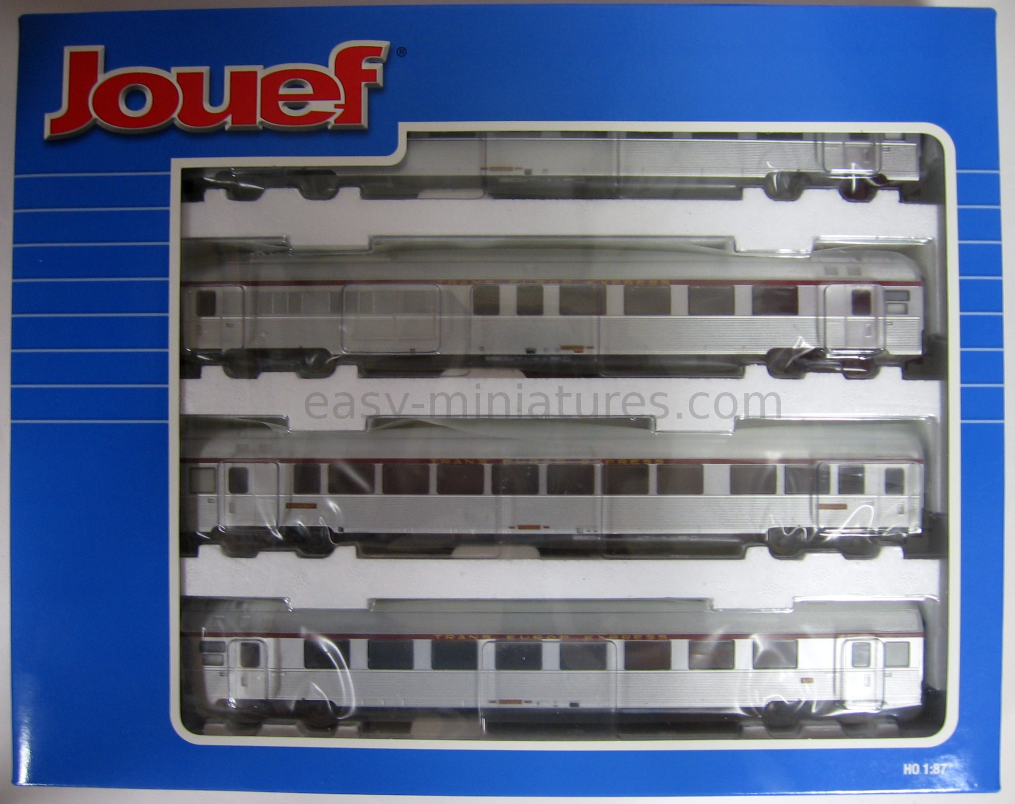 Coffret de la marque Jouef composé d'une voiture voyageurs, une voiture-bar, une voiture-restaurant et une voiture mixte voyageurs / bagages.