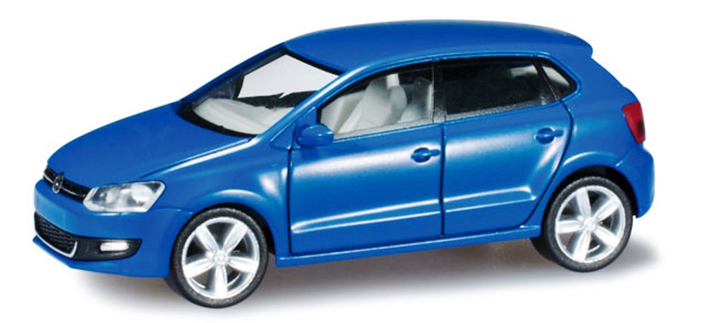 Modèle réduit Herpa représentant un véhicule Volkswagen Polo 4 portes de couleur bleu océan.