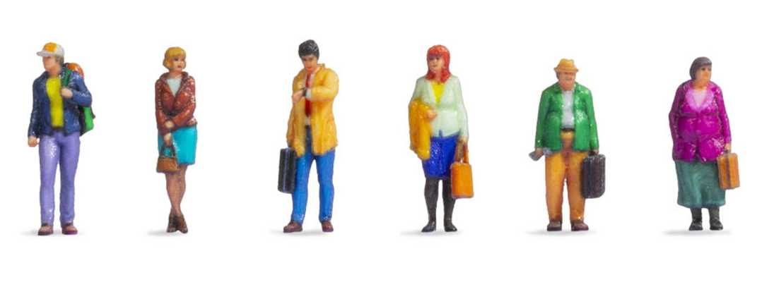 Ce lot de figurines Noch, référence 35300, contient 6 figurines plastiques imprimées en 3D représentant des voyageurs. Quatre personnages portent une valise, un autre un sac à dos et une dame un petit sac à main.