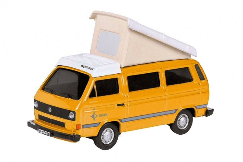 Modèle réduit Schuco représentant un véhicule, un VW T3 Westfalia toit ouvrant de couleur jaune.