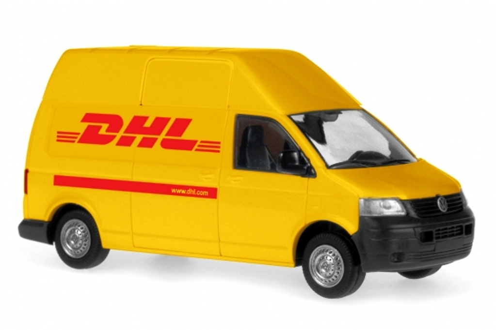 Modèle réduit Rietze finement détaillé représentant un véhicule Volkswagen T5 HD „DHL“ de couleur jaune.