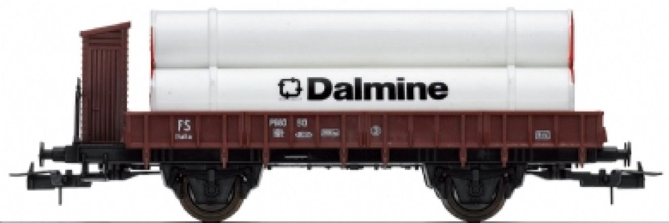 Wagon à bords bas avec guérite de frein. Chargé de tubes marqués "Dalmine"
