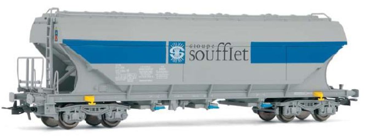 Modèle réduit JOUEF d'un wagon céréalier à faces planes de la SNCF, avec inscriptions du groupe Soufflet.