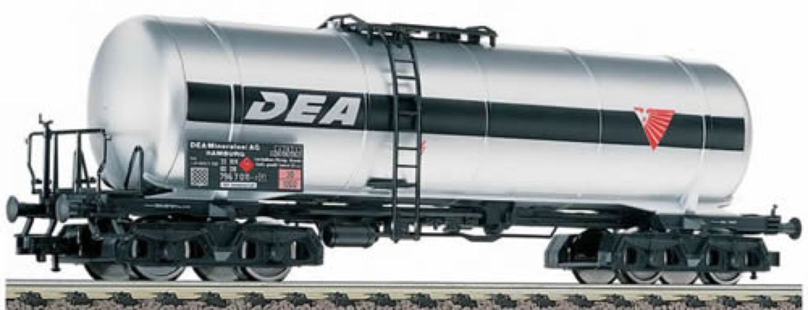 Modèle réduit FLEISCHMANN d'un wagon-citerne "DEA" avec plate-forme serre freins. Modèle du wagon de 77 m3 pour le trnsport de liquides