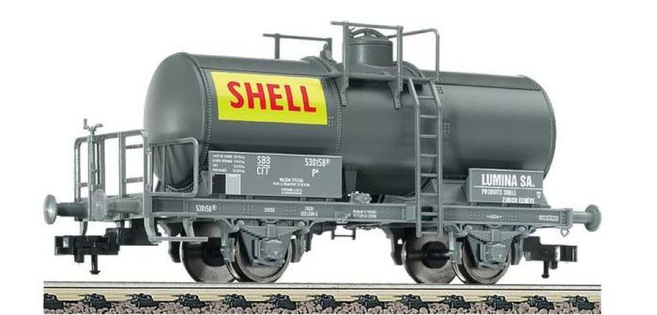 Modèle réduit FLEISCHMANN d'un wagon-citerne "Shell" avec plate-forme serre freins, utilisé par les CFF.