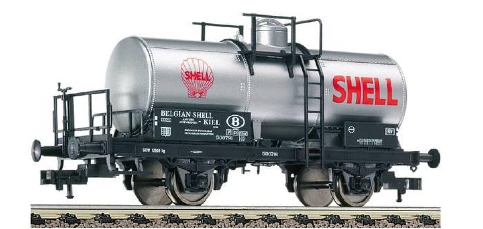 Modèle réduit FLEISCHMANN d'un wagon-citerne "Shell" avec plate-forme serre freins, utilisé par la SNCB