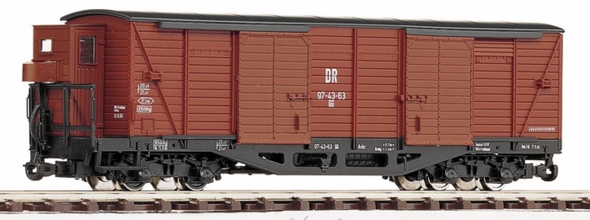 Modèle réduit finement détaillé de la marque Roco d'un wagon couvert à bogies de la Deutsche Reichsbahn (DR) avec guérite serre-frein. Echelle HOe