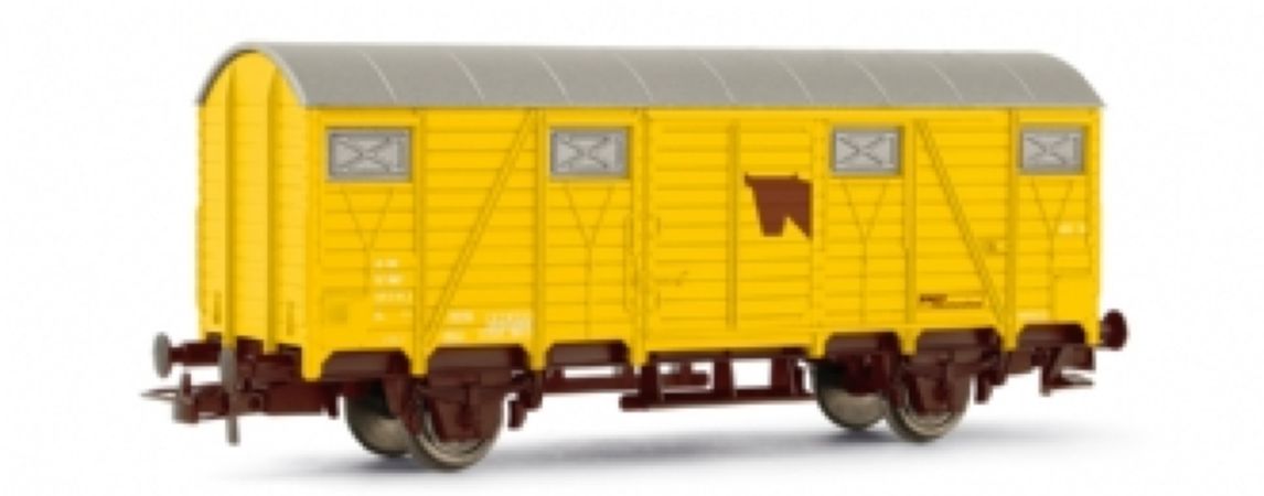 Modèle réduit de la marque Jouef d'un wagon pour le transport de bétail, décoration jaune, époque IV