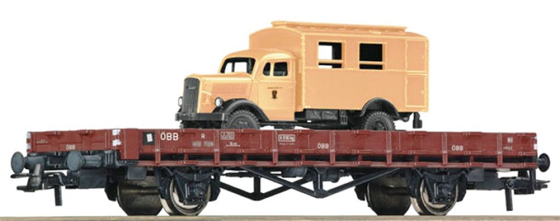 Modèle réduit Roco représentant 1 wagon plat chargé d'un camion - Opel blitz de la poste autrichienne - des chemins de fer autrichiens