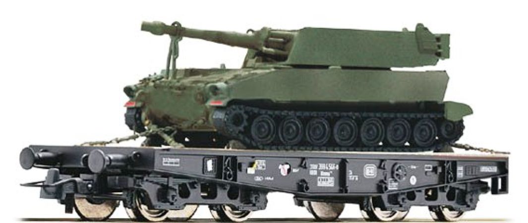 Modèle réduit Roco représentant un wagon pour transport de charges lourdes des Chemins de fer allemands, chargé d’un obusier blindé M108 de l’armée belge.