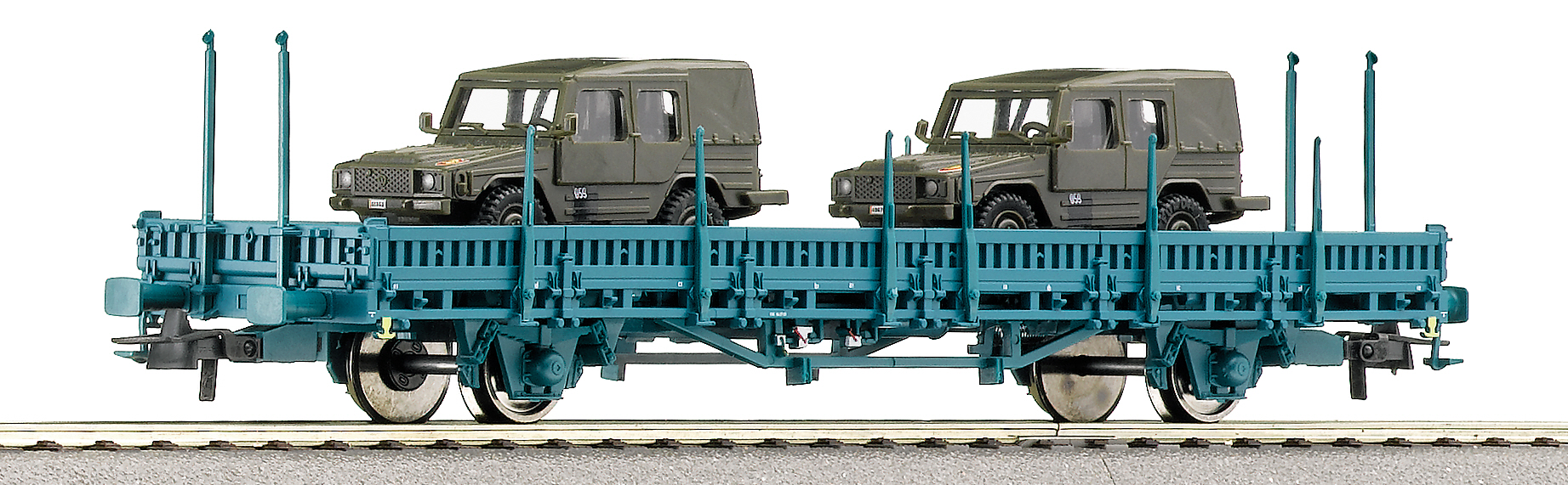 Modèle réduit ROCO d'un wagon plat à ranchers de la SNCB chargés de 2 véhicules légers de l'armée belge.