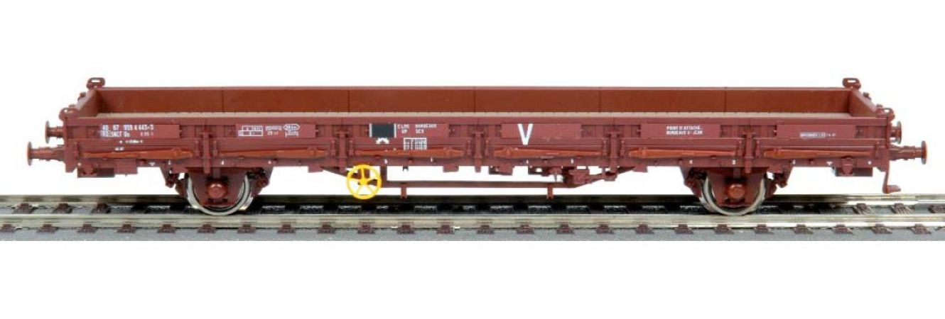 Modèle réduit d'un wagon plat à ranchers, type Ks50, de la SNCF, avec inscription “V”