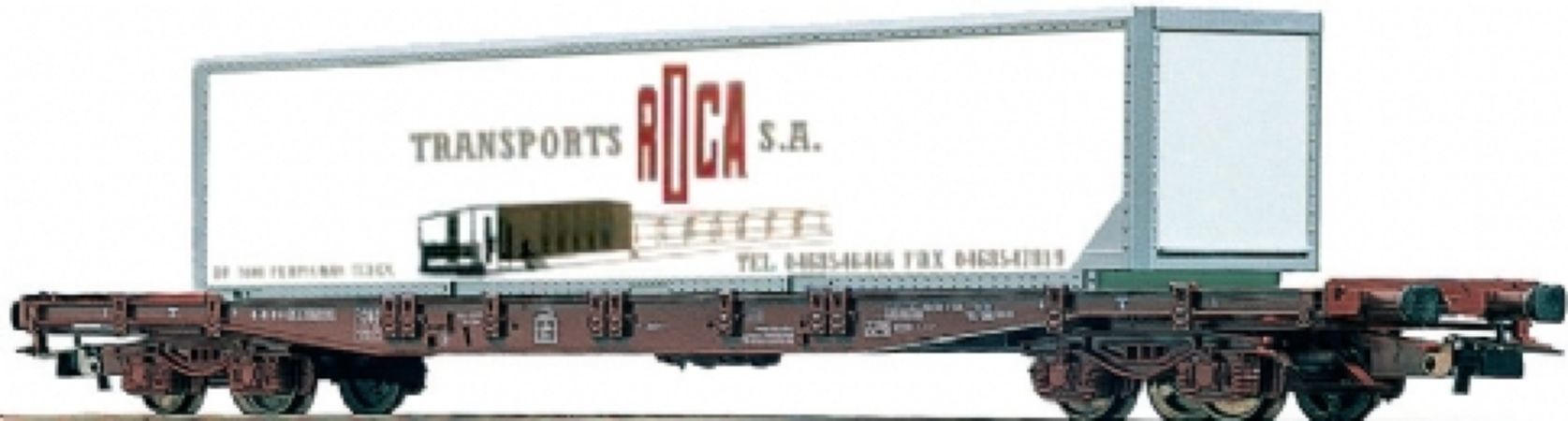 Wagon plat de la SNCF avec caisse mobile Roca.