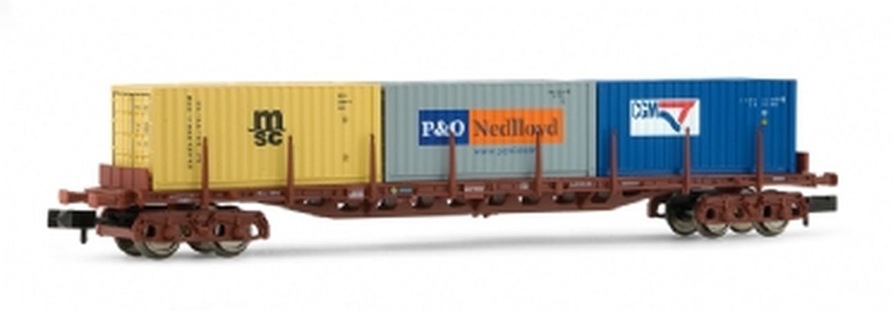 Modèle réduit de la marque Arnold d'un wagon plat dela RENFE chargé de 3 conteneurs