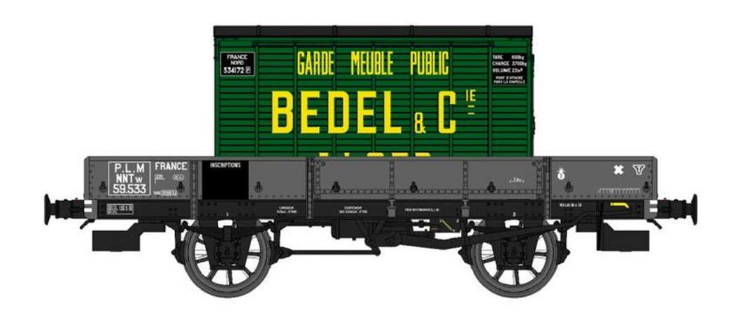 W025-G-04 Wagon freiné avec frein à levier, boites d’essieux à coussinets, roues à rayons Type B N° NNTw 59533 + Cadre Harasse Bois "BEDEL &Cie"