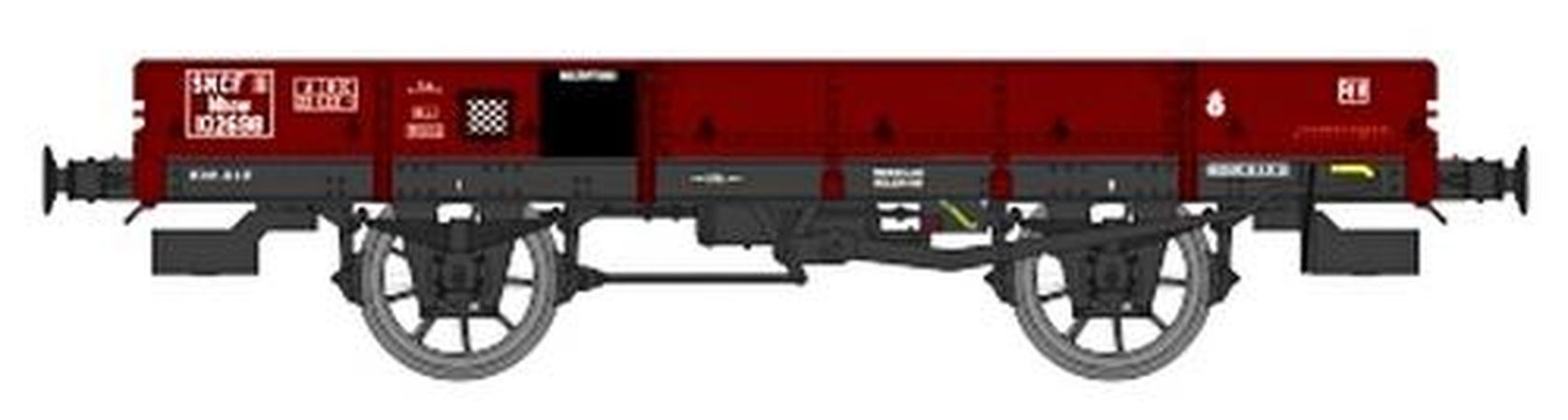 - W025-D-02 Wagon freiné avec frein à levier, boites d’essieux à coussinets, roues à rayons Type B N° Nhow 102698