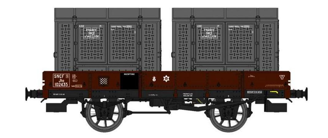 W025-D-03 Wagon freiné avec frein à levier, boites d’essieux à coussinets, roues à rayons Type B N° Jho 102435 + 2 Cadres OCEM a2b SNCF