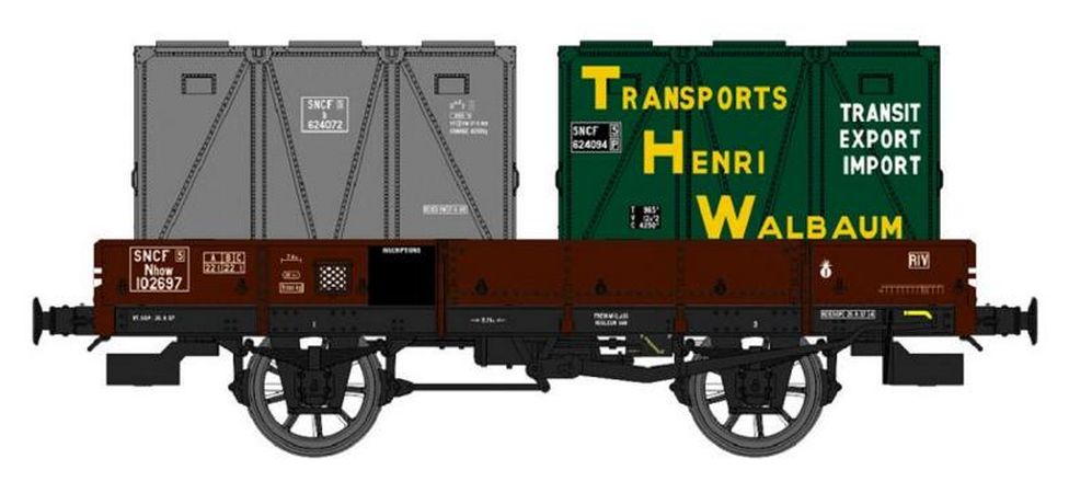 Modèle réduit REE représentant un wagon PLAT OCEM 19 Ep.III B présentant les caractéristiques suivantes : W025-D-04 Wagon freiné avec frein à levier, boites d’essieux à coussinets, roues à rayons type B N° Nhow 102697 + 2 Cadres OCEM B62 SNCF et "WALBAUM"