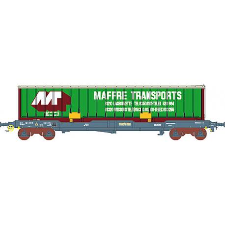 Modèle réduit LSModel finement détaillé représentant un wagon plat porte conteneur type K1 NOVATRANS avec caisse mobile bachée verte MAFFRE TRANSPORT numéro d'immatriculation : 33 87 452 5 169- 8