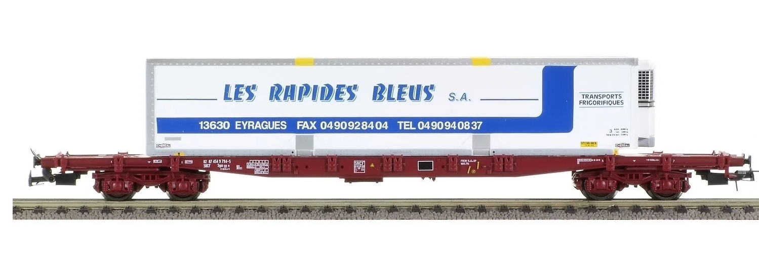 Wagon plat Sgss 63-6, SNCF avec container "Les Rapides Bleus SA"