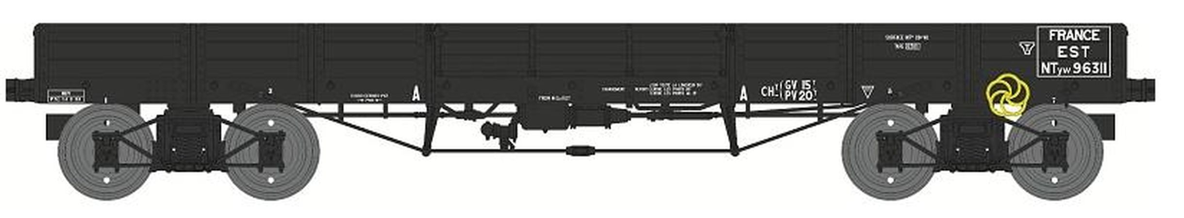 Modèle réduit REE représentant un wagon PLAT TP à 6 ridelles Ep.II EST présentant les caractéristiques suivantes W028-B-02 Wagon freiné, 4 roues pleines NTyw 96311