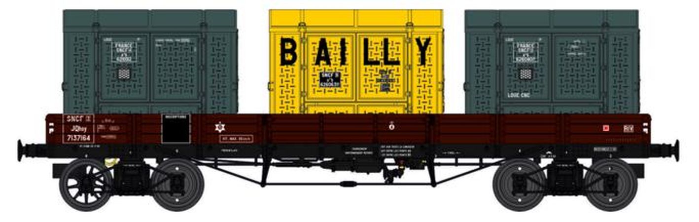 W028-C-02 Wagon freiné, 3 roues pleines et 1 roue à rayons JQhoy 7137164 + 3 Cadres SNCF