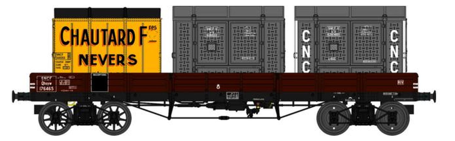 W028-D-04 Wagon freiné, 2 roues pleines et 2 roues à rayons Qhoyw 176465 + 3 Cadres SNCF