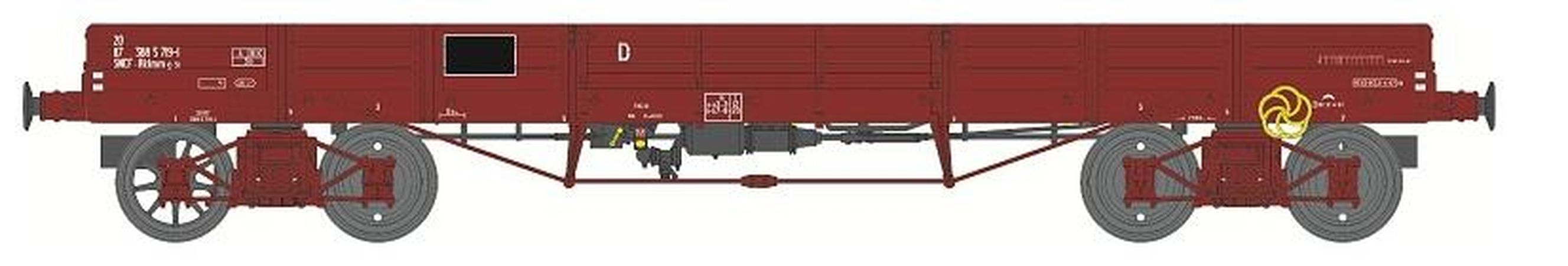 W028-G-01 Wagon freiné, 3 roues pleines et 1 roue à rayons N° 20 87 388 5 719-1