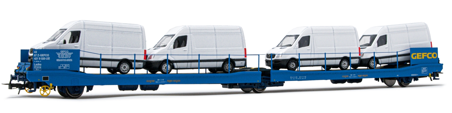 Wagon plate-forme à 3 essieux Ladks, GEFCO livrée bleu, chargé de 4 camionnettes Mercedes-Benz Sprinter