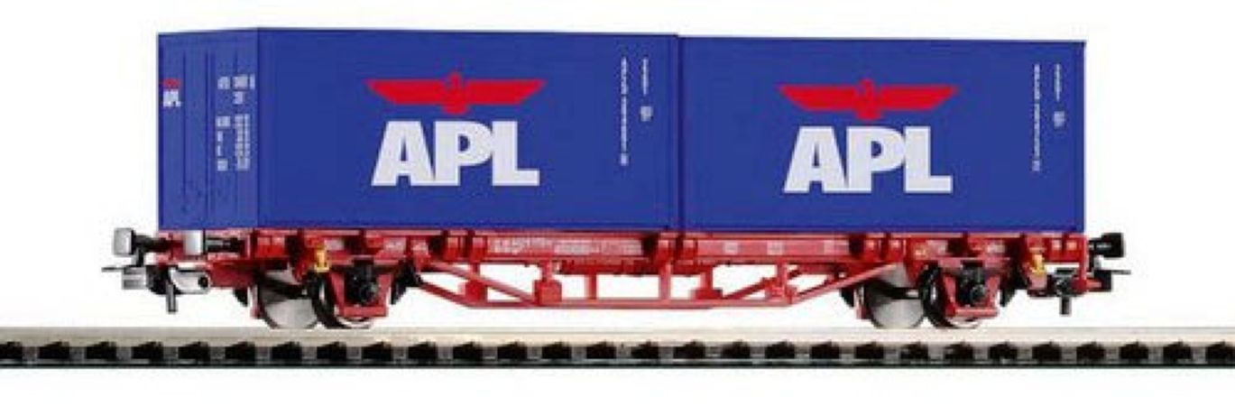 Modèle réduit Piko représentant un wagon de marchandisesn un Wagon porte container APL de la DB