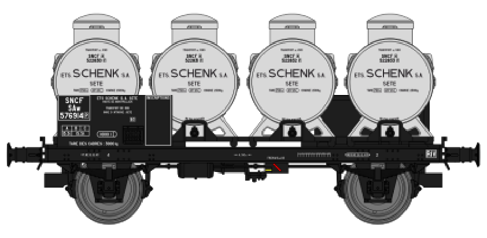 Caractéristiques : Porte-Container, boîtes d’essieux à coussinets, roues pleines, 4 x Citernes rondes "SCHENK"