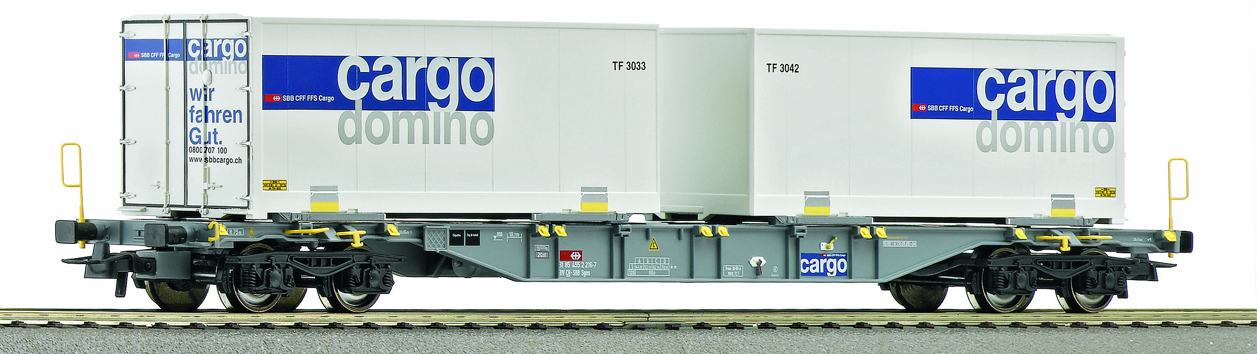 Dans l'état de service actuel (modèle réel), ce wagon, utilisé pour le transport de containers et caisses mobiles, est chargé de deux caisses frigorifique Cargo Domino.
