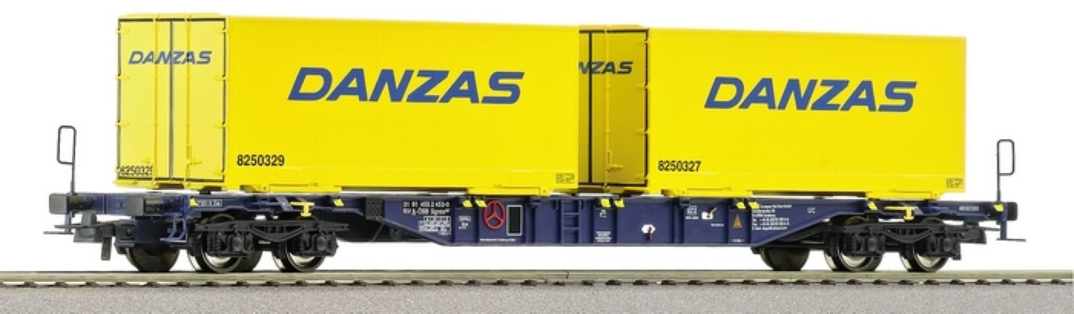Dans l'état de service actuel (modèle réel), ce wagon, utilisé pour le transport de containers et caisses mobiles, est chargé de deux caisses mobiles de la société Danzas.