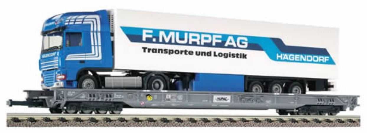Ce wagon sert de véhicule intermédiaire. D'un côté il est équipé d'un attelage surbaissé. Possibilité d'adapter les heurtoirs et les attelages automatiques des 2 côtés. Le wagon transporte un poids lourd Herpa "Murpf Ag".
