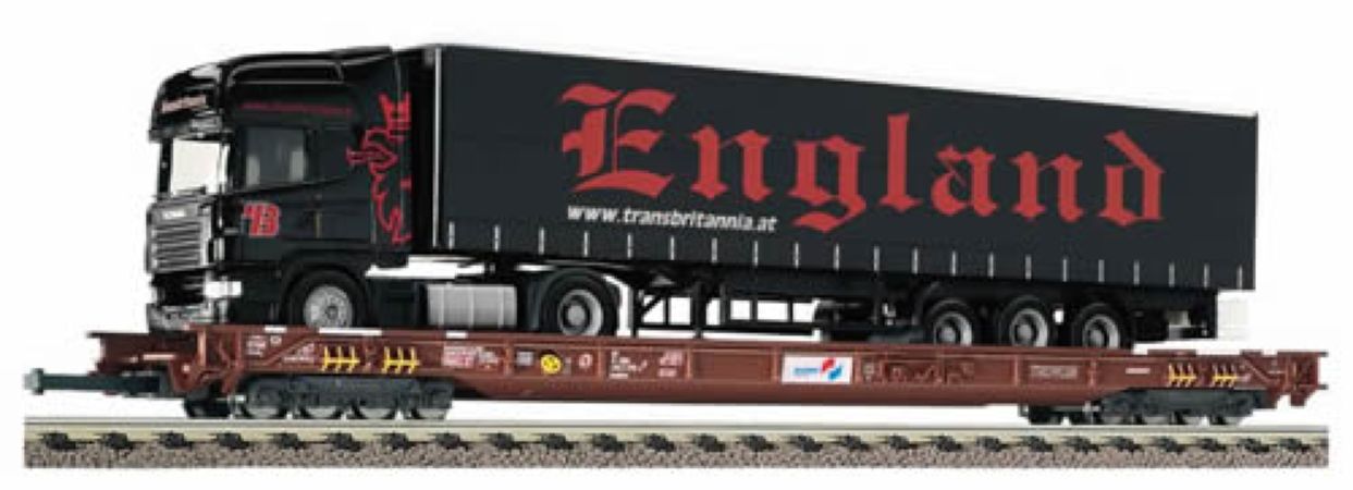 Ce wagon est placé en tête ou fin de convoi et est équipé de 2 attelages automatiques amovibles (un attelage surbaissé pour le wagon intermédiaire est fourni), avec heurtoirs amovibles des 2 côtés. Le wagon transporte un poids lourd Herpa "Birmingham".
