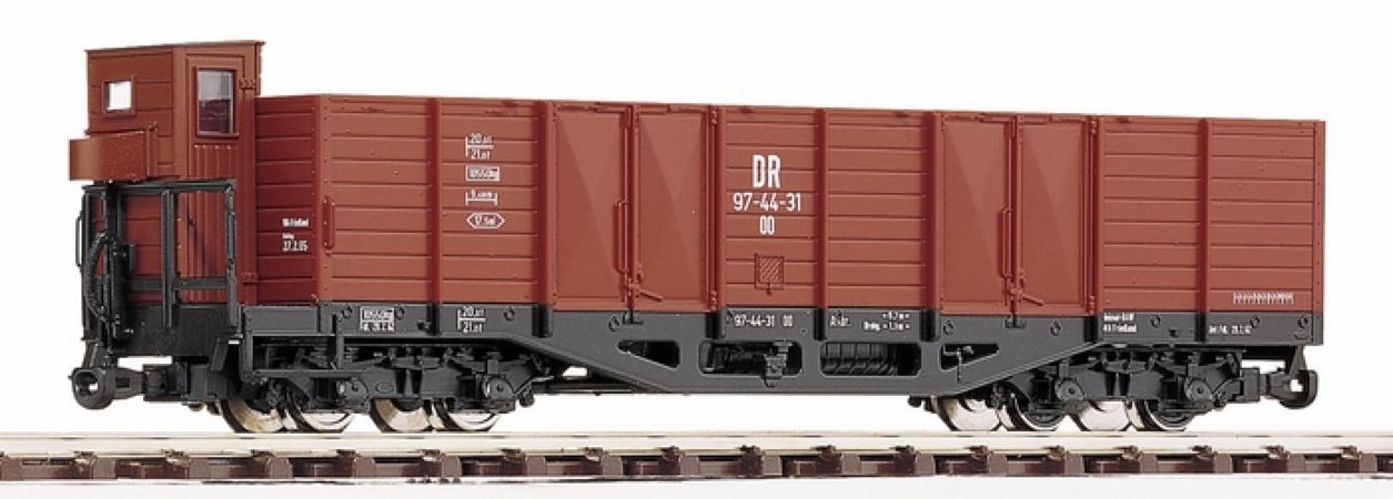 Modèle réduit finement détaillé de la marque Roco d'un wagon tombereau à bogies de la Deutsche Reichsbahn (DR) avec guérite serre-frein.