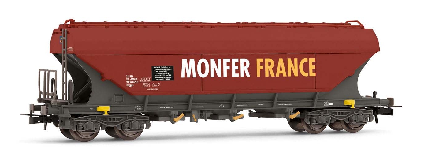 Modèle réduit fabriqué par JOUEF représentant un wagon trémie à 4 essieux Uagpps à parois plates, livrée rouge-noir "MONFER France"