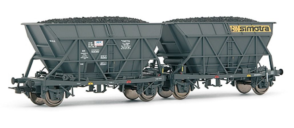 Modèle réduit de la marque Electrotren d'un wagon trémie double de la SNCF, "SIMOTRA".