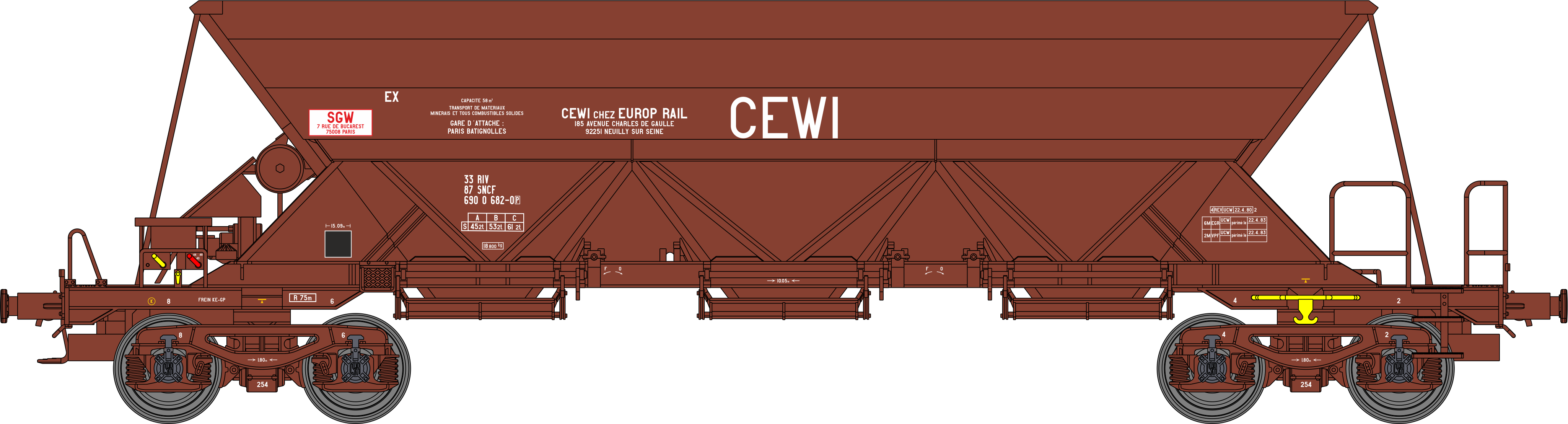 Modèle réduit représentant un wagon trémie EX Type 3 pour le chargement de sable en livrée CEWI.