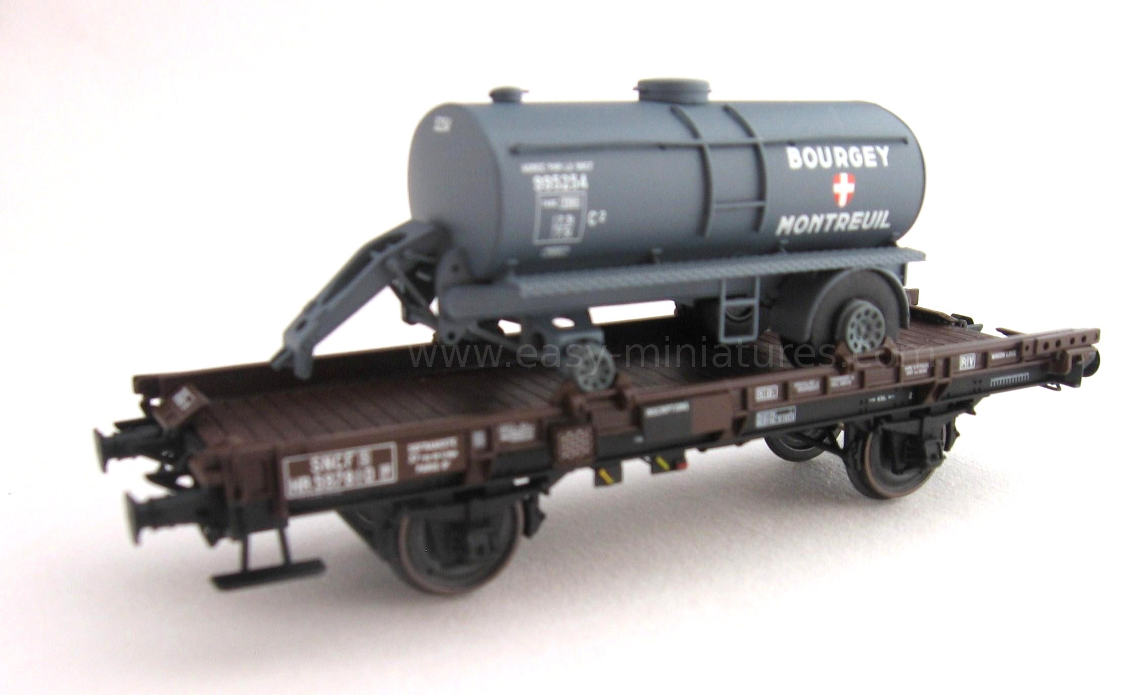 Modèle réduit d'un wagon UFR Mono-Porteur SNCF chargé d'une remorque citerne "BOURGEY-MONTREUIL"