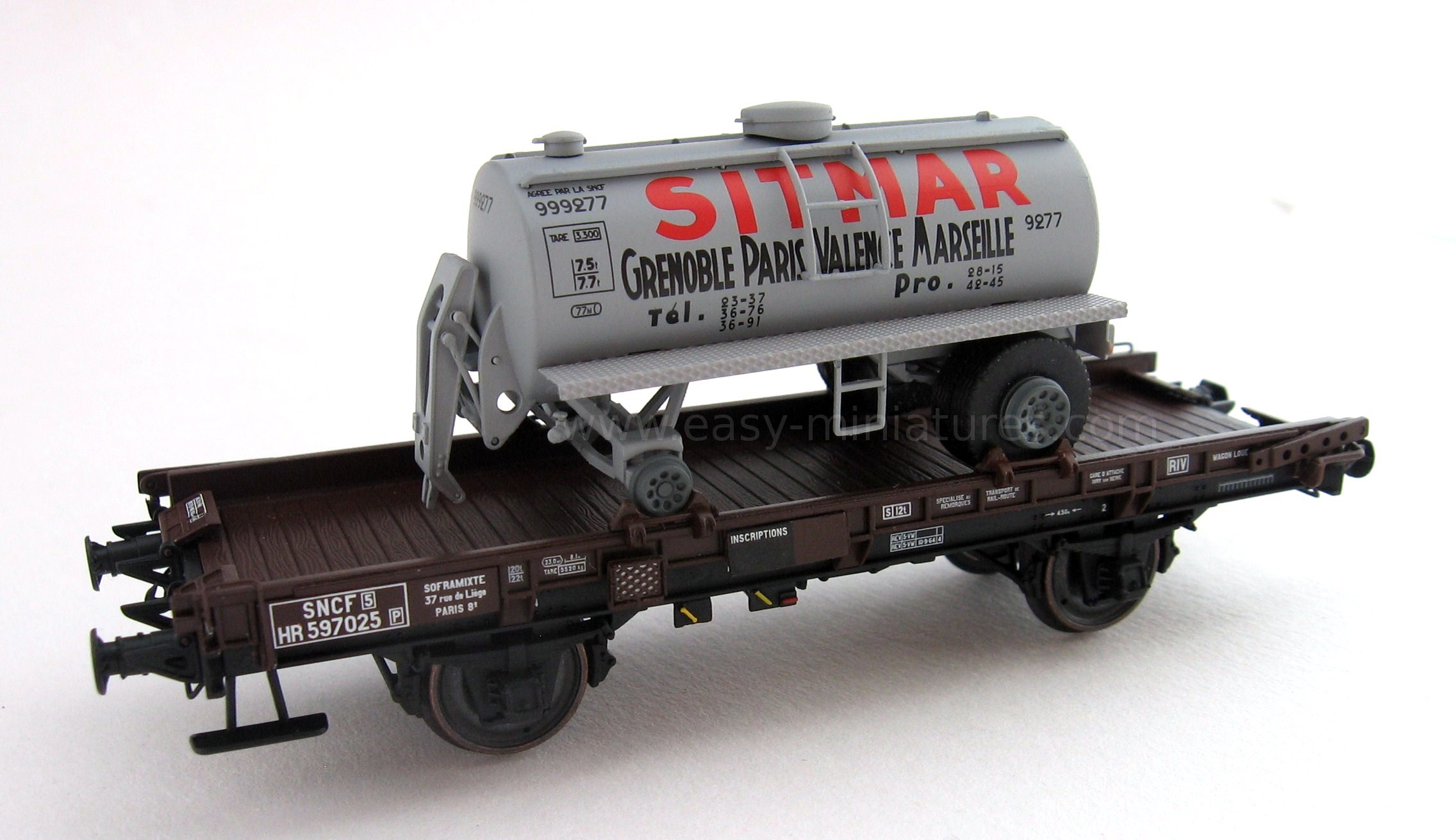 Modèle réduit d'un wagon UFR Mono-Porteur SNCF chargé d'une remorque citerne ronde "SITMAR"